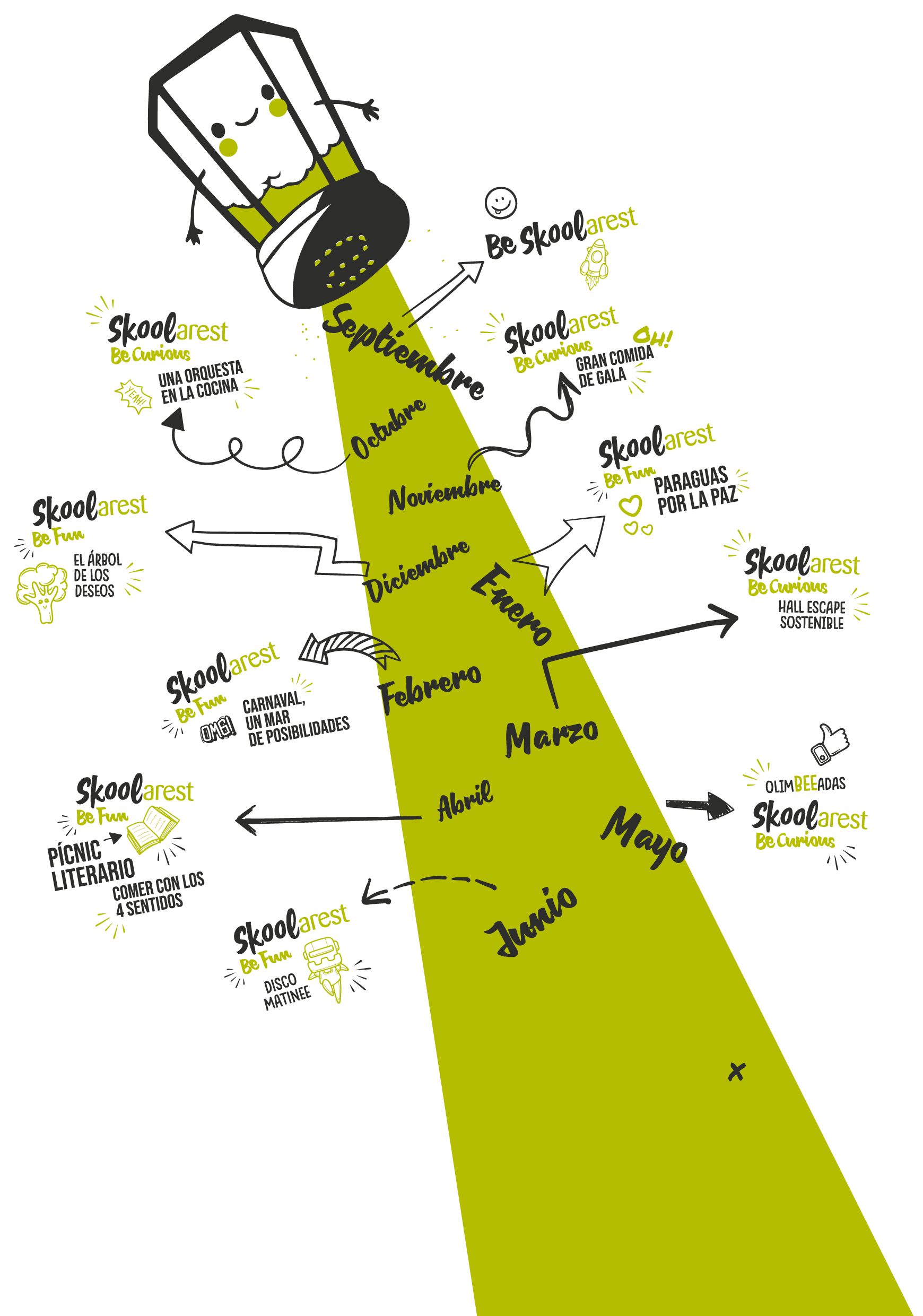 Be Curious, Be Skool es una programación competencial e innovadora que tiene como objetivo generar estímulos que activen la curiosidad de los niños y niñas. A través de nuestra propuesta de actividades provocaremos preguntas e incitaremos a la búsqueda de respuestas, creando una experiencia de comedor donde no sólo alimentamos nuestro cuerpo, sino también nuestras emociones y relaciones con los demás.